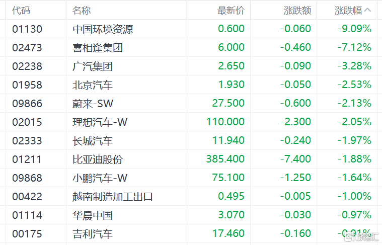 汽车股普跌,喜相逢集团跌超7%,广汽集团、北京汽车、蔚来、理想汽车、长城汽车、比亚迪股份等下跌。
