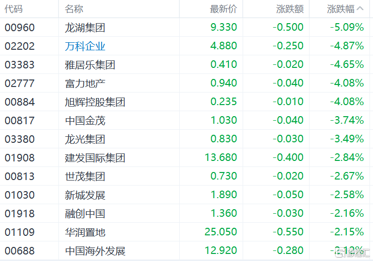 内房股跌幅居前,龙湖集团跌超5%,万科企业、富力地产、中国金茂、龙光集团、建发国际集团等跟跌。
