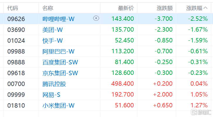 权重科技股涨跌互现,美团、快手跌超1%,阿里巴巴、百度、京东微跌;网易、小米涨超1%,腾讯控股跟涨。