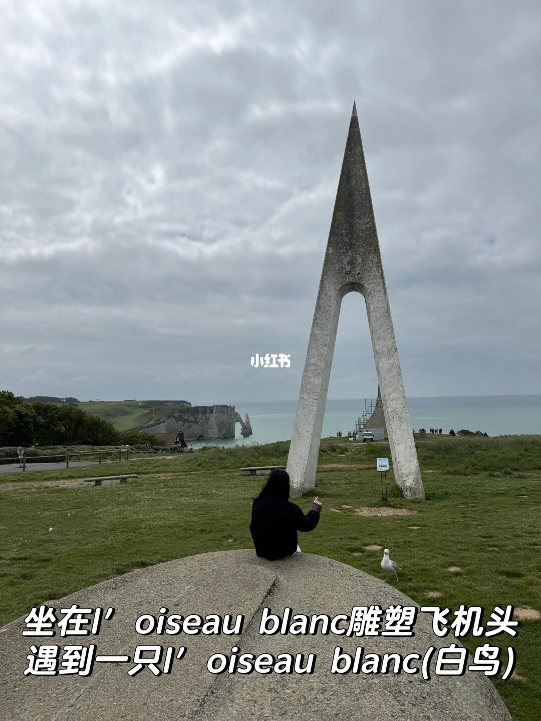 ✈️可以看到为纪念1927年试图横跨大西洋的两位法国飞行先驱Nungesser与Coli建造的L’Oiseau Blanc飞机雕塑纪念碑。他们首次尝试从巴黎无中断飞纽约,飞机最后一次被目击是在Étretat上空,随后在大西洋上神秘消失,成为航空史上的重大未解之谜