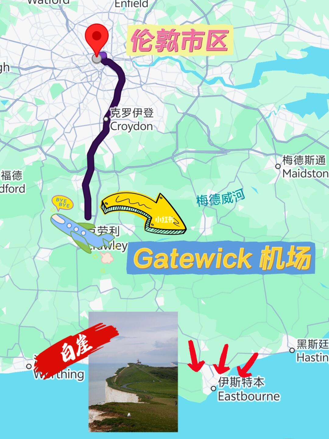 [向右R]对于起点盖特维克机场如图2,我多一句嘴,这里靠近白崖,大家有兴趣的,可以先去伊斯特本,看看白崖,伊斯特本如何去白崖,我之前的笔记有,大家去看就好。