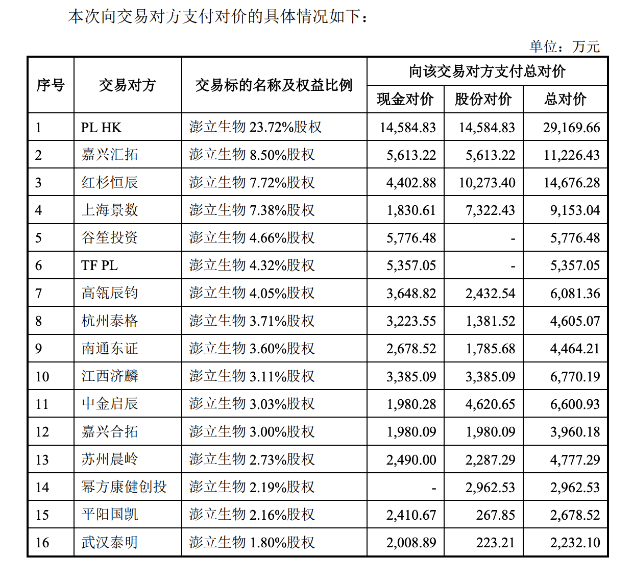 具体来看,PLHK(标的公司控股股东)交易对价为2.92亿元,对应澎立生物100.00%股东权益价值为12.3亿元;嘉兴汇拓、嘉兴合拓(管理团队股东)合计交易对价为1.52亿元,对应澎立生物100.00%股东权益价值为13.2亿元。