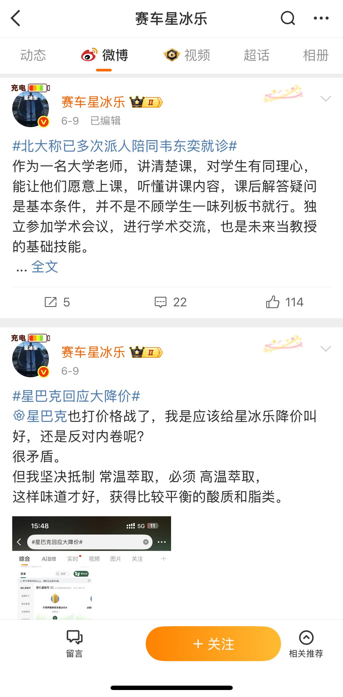 赛车星冰乐被抓,某车企大佬偷偷删除之前转发他的微博?这则消息早上挺热,特意搜了下这个“赛车星冰乐”,是个车评人,但也对一些热点进行评论,例如他对韦东奕和星巴克降价就发表过看法 不过他好像对某一款车情有独钟,感兴趣的可以去看看,但他为什么被抓呢?据说是因为发表了对其他车企不好的言论,敢情是碰到硬茬了 所以他被抓后某车企大佬删曾经转发他的微博,让网友们认为这是在与他进行切割,估计他犯的事还不小,要不怎么想划清界限呢?