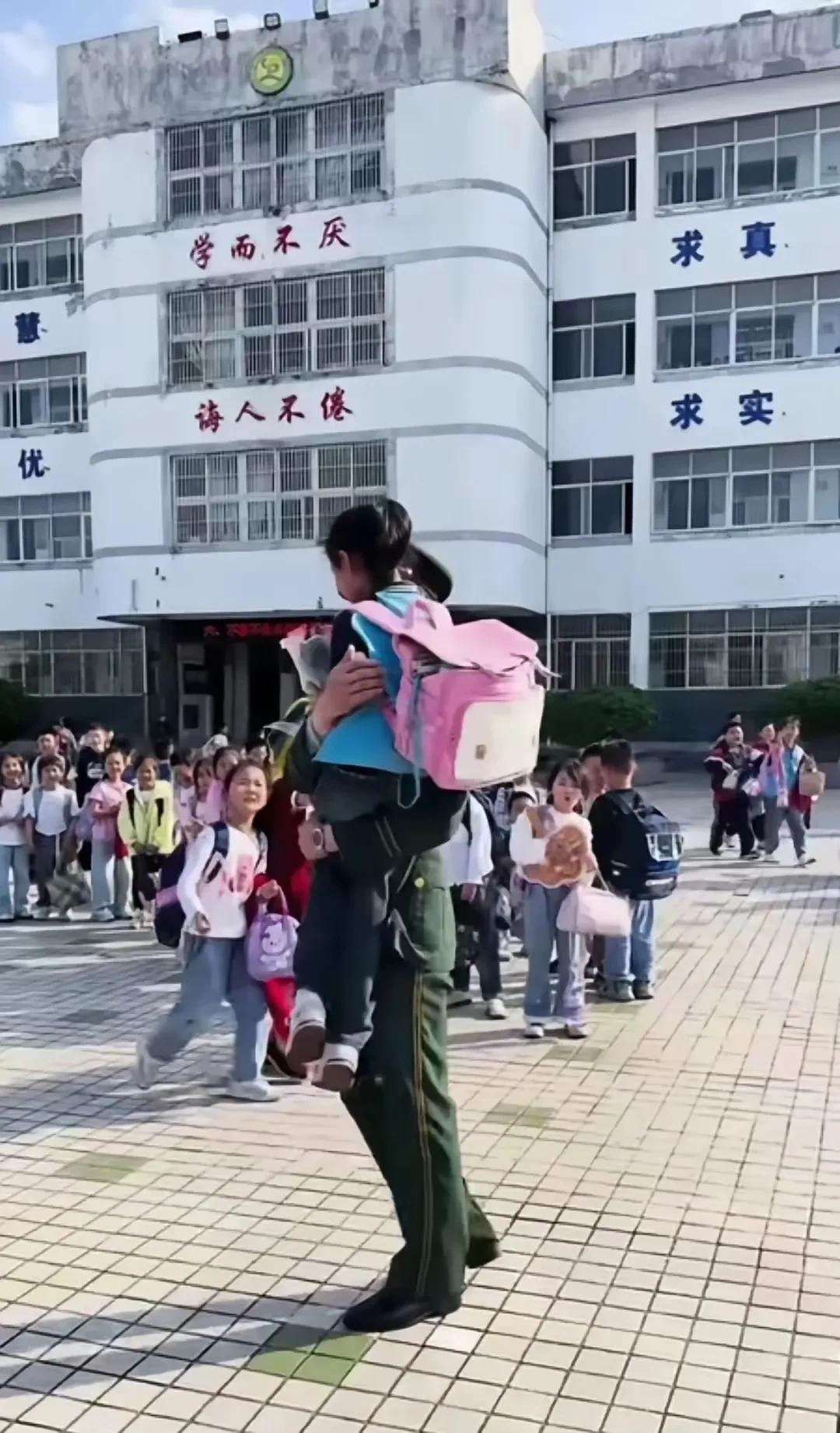 放学时分,扎马尾的小女孩正跟着队伍走。身着军装的爸爸突然现身,一把将她高高抱起!
