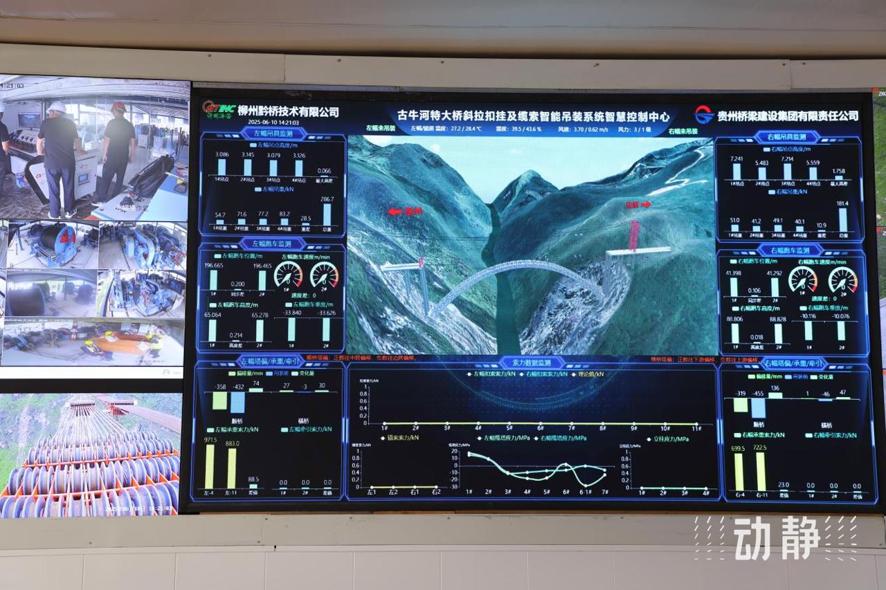 运输难题解决后,项目建造团队在采用贵州桥梁集团自主研发的智慧缆吊系统基础上,首创吊装轨迹精准控制技术,为节段吊装装上了“智能导航”。该技术融合传感器与先进算法,始终保持吊具的相对高差不变,自动调节主拱肋在空中吊运姿态及安装姿态,确保节段在平移、就位沿着最优路径平稳、精准抵达预定位置,有效保证了整个吊装过程安全可控。