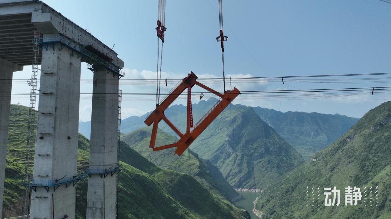 古牛河特大桥是安盘高速控制性工程,全长881.8米,主桥横跨古牛河,采用计算跨径520米的上承式钢箱桁架拱桥,跨径居同类桥梁世界第二,主桥桥面到谷底高度约400米,在世界高桥中排名第15位。大桥主桥由主拱肋、拱上立柱、钢盖梁、钢主梁组成,采用全钢结构设计,总重量约为3.1万吨,大桥主拱圈共计88个节段(含合龙段),当天吊装节段为安顺岸NS1节段,为全桥最重节段。