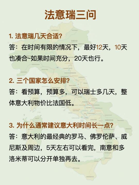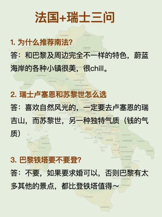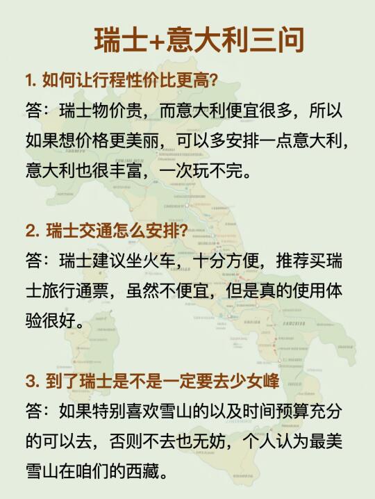 最近很多粉丝问我,第一次去欧洲,不知道该怎么选?我的建议是,第一次去欧洲,首选法意瑞,因为这个组合集合了自然和人文,非常具有代表性,也就是常说的经典,具体路线怎么选择,我在图片里做了简单对比,大家可以参考。