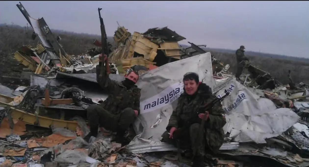 2014年马航MH17坠毁面前,俄属士兵在残骸前拍照留念。 不知道他们当时是否清