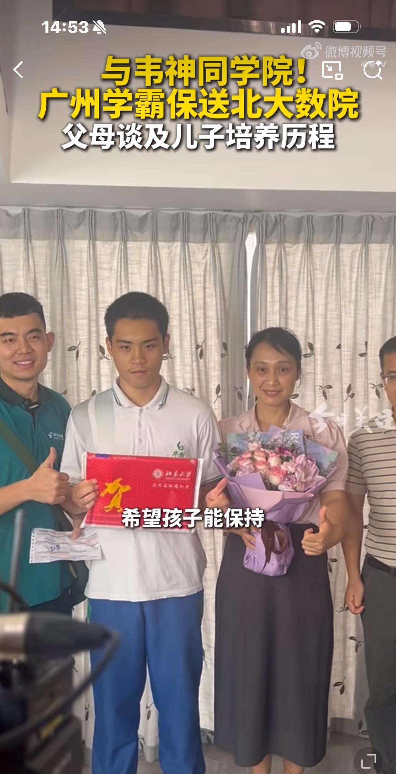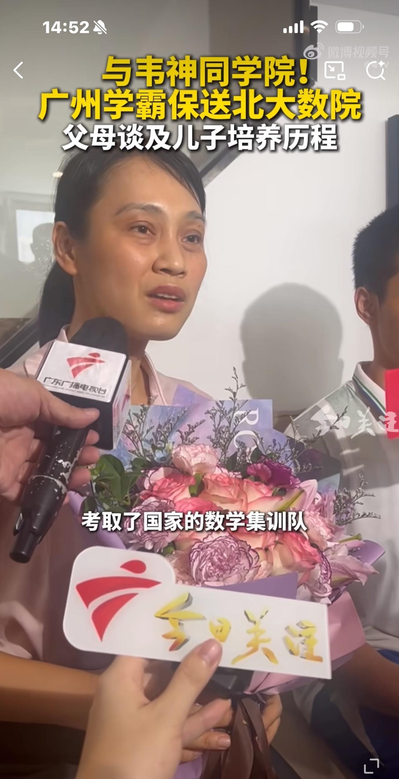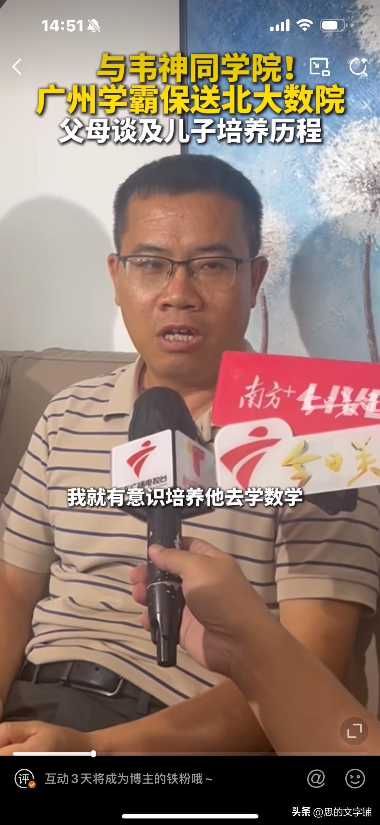 这位陈同学长得像韦神,被保送到北大数院,昨天收到了录取通知书,韦神是他的偶像,之前,他还听过韦神的课呢! 陈同学全名叫陈睿康,之前是广州华南师范大学附属中学高中生,家住广州海珠区。 陈爸爸戴副眼镜,文质彬彬,接受采访时也颇感自豪,回忆儿子的成长经历说: “孩子读幼儿园,大概三岁多的时候,发现他通过下楼梯(电梯)来理解负数的概念,所以从那时候起,我就有意识地去培养他学数学。” 而陈睿康坐在一边的沙发上,耐心倾听着爸爸讲述自己小时候的故事,展开自己的北大录取通知书,不由自主露出了笑容,还用谦和的眼神看着爸爸,一看就是一个稳重又淡定的男孩,而且,他也很爱爸爸。 陈妈妈打扮朴素,浓眉大眼,脑后扎了一个低矮的辫子,大四五十岁的样子,她接受采访时也说: “儿子是从低年级开始,就参加一些奥数的课程培训,初中开始就学习高中的知识,高一开始就正式打竞赛,第二年就很幸运地考取了国家的数学集训队,获取了北大的保送资格。希望孩子能保持一个原点的心态,继续努力,将来勇攀数学高峰,为国家、为社会做出一点微薄的贡献。” 陈妈妈发言比较有水平,看起来像一个老师,说话声调不高,轻言细语,一看就是低调、不事张扬的类型,孩子现阶段取得了好的成绩,并不代表永远,她现在想的是孩子的未来,以后托举他走得更高更远吧。 陈睿康肤色较黑,理个平头,穿了一件旧旧的校服,外表看起来很沉闷,没想到他在接受采访时一点也不怯场,他大大方方,字正腔圆,侃侃而谈说: “我是高二的时候入选的国家集训队,当时也选择了北大数院,过去的一年,我也在北大数院旁听了一年,我还听过韦神的半节课,但是因为我自己的学习进度不快,就是很多前置知识我并没有学,所以我听不懂他的课,我要戒骄戒躁。” 陈睿康不卑不亢,既为自己的学有所成感到开心,又准备好心态迎接下一个挑战,他说话的时候和记者还有眼神交流,看起来是很优秀、很谦虚的一个孩子。 努力吧,追随光,成为光! [星星眼][星星眼]