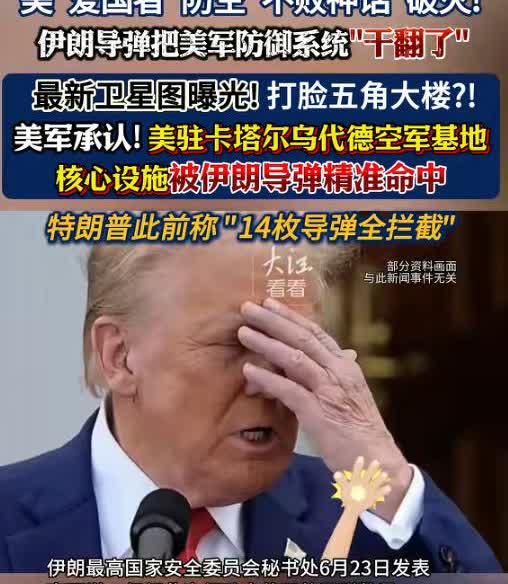 瞒不住了,美国军事基地1500万通讯雷达被伊朗炸毁,部署的“爱国者”防空导弹直接成了摆设,这次丢脸丢大了 以伊冲突结束后,美军三番五次的强调赢麻了,他为以色列出头不过是擦破了点皮: “伊朗发射的14枚导弹,全都被美军的防空系统给拦截下来。” 但比较尴尬的是卡塔尔方表示,伊朗前前后后至少发射了19枚,那消失的5枚,大概率就是美军没拦截成功的。 与此同时,一张图片也在外媒曝光,是美国在卡塔尔的乌代德空军基地核心设施被摧毁的画面。 可以看得出来,基地中的高端通信雷达几乎已经报废,闲置在现场风吹日晒。 这样的结果和美国早先一再强调的毫无损失相矛盾,不过比起雷达被击中,更尴尬的是一直被美军引以为傲的“爱国者”防空导弹系统成了摆设。 根据公开信息,在这座空军基地内,美国部署了两套“爱国者3”防空导弹系统。 按照伊朗发射导弹的数量来看,美国这防空导弹拦截应该是绰绰有余的。 结果不仅两套都用上了,还没把导弹给拦全,这不就变相地指出“爱国者”导弹理论和实际数据的差距至少是一半吗? 另外,在伊朗发射导弹之前,特朗普还高高在上地瞧不上伊朗,讽刺伊朗打他前还要提前通知。 搞笑的是,通知是给到了,防御的时间也足够充足了,军事基地竟然还被击中,简直是丢脸丢大了。 1500万的雷达对美国来说不算贵,但被揭穿没有100%拦截导弹的能力,美国简直亏麻了。