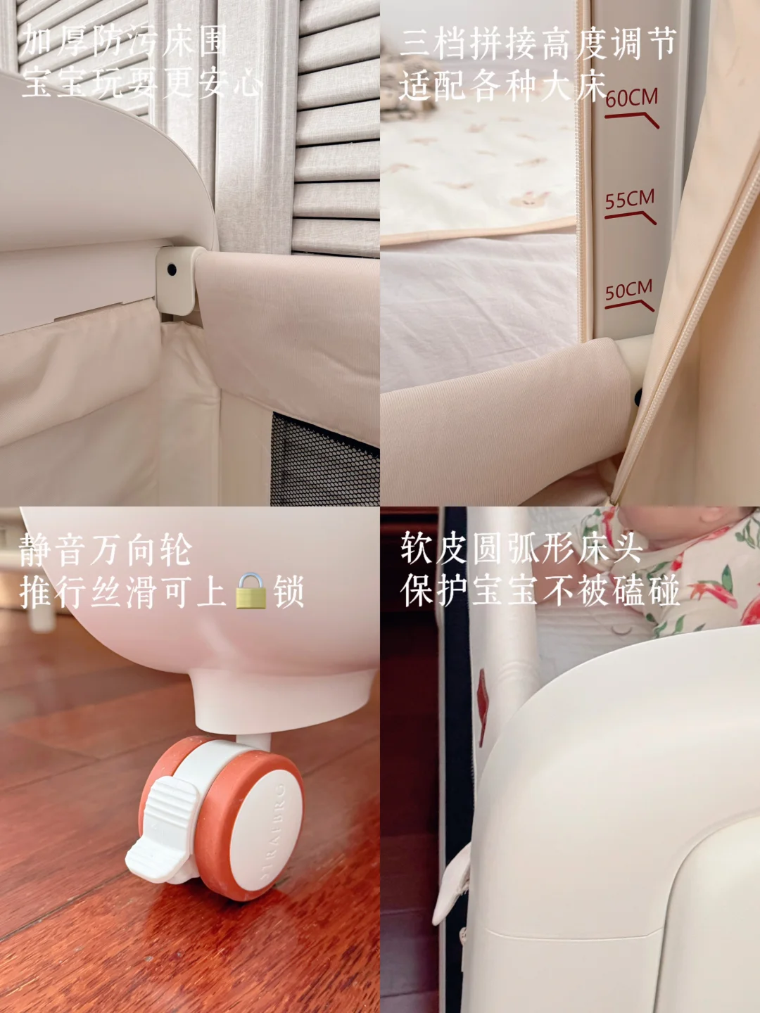 四个静音万向轮顺滑好推拉,自带锁扣可以一键锁住,白天还可以推到阳台让宝宝晒会儿太阳~