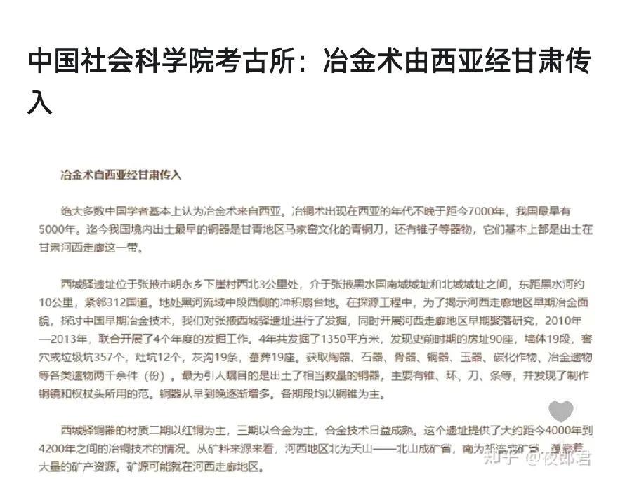 【中国古代青铜技术来源于西亚】 根据中国社科院考古所的报告,中国古代冶金技术包括青铜冶炼都是通过西亚通过甘肃传入内地,西亚冶金术有7000年历史,中国新疆甘肃有5000年历史。也就是说我们辉煌的商周青铜器冶炼技术来源于西亚。 其实在古代西亚,有大量的东伊朗语群,最早是两河文明和雅利安文明的辐射之地。