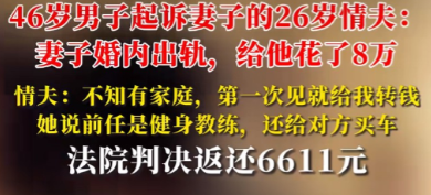 辽宁阜新,46岁男子得知妻子与26岁小伙发生不正当关系,还给对方花了8万元,一气之下将小伙告上法庭,要求小伙还钱。怎料,法院审理后,仅判决小伙返还6611元。咋回事?