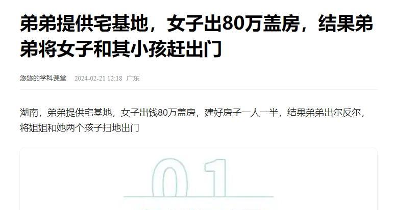 湖南娄底,女子离婚后,带着80万和两个儿子,投奔了娘家,看弟弟穷的房倒屋塌,就决定她出钱,弟弟出宅基地,盖6层楼一人一半,没想到,房子盖好后,弟弟竟翻脸无情,把她一顿暴揍扫地出门,独占房子,女子嚎啕大哭:我钱没了,亲情也没了,我该咋活啊!万般无奈之下,郑春桃只得与弟弟对簿公堂,最终法院做出了判决! 你有没有想过,帮了亲人一把,最后却被亲人捅了一刀?这就是发生在湖南娄底的郑春桃的故事。她离婚后带着80万和两个儿子回到娘家,本想帮弟弟盖个楼安家,却没想到房子盖好后,弟弟翻脸不认人,把她暴揍一顿赶出门,独吞了房子。钱没了,亲情也没了,她该怎么办?这个真实的故事,充满了悬念和心酸,接下来就带你走进郑春桃的遭遇。 郑春桃是湖南娄底本地人,年轻时嫁了个外地男人,开始还挺甜蜜,生了两个儿子后,丈夫却变了心,整天在外花天酒地。她忍了好几年,最后实在受不了,决定离婚。法院判她带着两个儿子和80万的财产回了娘家。那时候,她觉得自己总算能喘口气,靠着这笔钱和娘家的支持,日子还能过下去。谁知道,这只是她苦难的开始。 回到娄底农村的娘家,郑春桃发现家里情况糟透了。母亲早就去世,父亲病得下不了床,弟弟郑春海日子过得更惨,房子破得像随时要塌,连个像样的屋顶都没有。她看着弟弟那穷酸样,心里挺不是滋味,毕竟是一家人,总不能见死不救。于是,她主动提出个主意:她出80万,弟弟出宅基地,盖一栋六层楼,完工后一人一半。这样既能改善弟弟的生活,自己也能有个安身之处。 说干就干,郑春桃把80万全投进去,开始盖楼。她不是那种甩手不管的人,从选材料到挑施工队,她都盯着,生怕哪里出了岔子。弟弟呢,宅基地是他的,他也偶尔搭把手,但主要是她忙前忙后。几个月下来,楼终于盖好了,六层高,在村里算得上气派。郑春桃想着,这下总算有个家了,两个儿子也能有个像样的地方生活。可她万万没想到,噩梦才刚开始。 楼盖好后,麻烦来了。郑春桃想着自己出, 她提出自己住一到三层,方便带孩子,弟弟和弟媳住上面。可弟弟不干了,说宅基地是他的,房子就该全归他。两人争了几句,弟弟突然发火,直接动手,把郑春桃推倒在地,还拳脚相加。她被打得鼻青脸肿,弟媳在一旁冷眼旁观,没一句劝阻的话。最后,弟弟把她和两个儿子赶了出去,扬言房子是他的,谁也别想分走。郑春桃坐在地上,看着自己花了80万盖的楼,哭得撕心裂肺。 被赶出门后,郑春桃彻底懵了。80万没了,家没了,连亲弟弟都靠不住,她带着两个儿子只能临时挤在父亲的小破屋里。她越想越不甘心,这钱是她离婚后好不容易争取来的,凭啥让弟弟白占了?她找到村里人评理,可弟弟一口咬定宅基地是他的,村里人也帮不上忙。没办法,她只能硬着头皮去法院告弟弟。她攒齐了转账记录、施工收据这些证据,铁了心要讨个说法。 法庭上,郑春桃把事情原原本本说了出来,强调自己掏了80万盖楼,弟弟却恩将仇报。弟弟倒打一耙,说宅基地是他的,姐姐不过是“借钱”给他盖房,没资格分房子。法官看了证据,又问了几个证人,最后认定郑春桃的80万是实打实的出资,弟弟占房属于不当得利。法院判弟弟得还她80万建房款,外加医药费和精神损失费。因为动手打人,弟弟还被罚了款。这场官司打赢了,可郑春桃心里一点也不痛快,毕竟亲情没了,再多钱也买不回来。 官司结束后,郑春桃拿回了钱,带着儿子搬到镇上租了个小房子,开始新的生活。她靠着剩下的钱做点小生意,慢慢撑起这个家。弟弟那边呢,村里人听说这事后,都对他指指点点,说他没良心,连亲姐姐的钱都坑。他占了房子,可日子过得并不舒坦,听说后来还跟媳妇吵架闹离婚,家里乱成一团。郑春桃偶尔听人提起弟弟,也只是摇摇头,不想再掺和。 这事在农村挺少见的,毕竟中国人讲究家和万事兴,亲兄弟姐妹之间闹成这样,真是让人唏嘘。在湖南娄底这样的地方,家里人互相帮衬是常事,可一旦牵扯到钱,亲情就变得脆弱不堪。郑春桃的遭遇,不光是她一个人的悲剧,也让人忍不住想,到底是钱害了人,还是人自己贪心不足?还有法律这东西,虽然最后帮她讨回了公道,可感情上的窟窿,谁来填? 郑春桃的故事让人心里五味杂陈,帮亲人盖房却被扫地出门,钱没了亲情也没了,你说她冤不冤?换成是你,会不会也跟弟弟翻脸?或者你身边有没有类似的糟心事?欢迎在评论区聊聊你的想法,咱们一起说说这亲情和利益,到底咋摆平。
