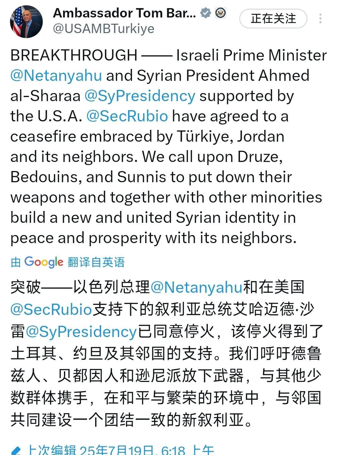 7月19号,根据美国驻土耳其大使兼叙利亚问题特使Tom Barrack在个人社交账号上发布的消息,叙利亚和以色列之间的停火协议已经达成。那么,这份协议是如何实现的,哪些人、哪些国家在其中发挥了作用呢? 根据目前所有的消息,这份协议是由以色列总理内塔尼亚胡和叙利亚新政权领导人沙拉之间共同达成的,因此协议本身的签约层级和稳定性应该可以得到很大程度的保证。而最主要的斡旋方,应该是美国国务卿兼国家安全事务助理鲁比奥。这一点也不难理解。美国目前不仅在叙利亚和以色列都有巨大利益,而且对两方都有绝对的影响力。因此,美国作为斡旋方,似乎不仅是最佳的选择,也是唯一的选择。 而在美国驻叙利亚大使的发文当中,还特别强调了这份停火协议“得到了土耳其、约旦和其他地区邻国的共同支持”。其中最主要的,恐怕还是土耳其,毕竟他是目前叙利亚背后的最大军事支持力量。周五晚上,鲁比奥才和土耳其外长费丹进行了一次通话。因此,土耳其保持战略克制,恐怕是这份停火协议达成的重中之重。这也说明了美国和土耳其之间,无论是双边渠道还是在北约的框架之下,其沟通是非常顺畅的。