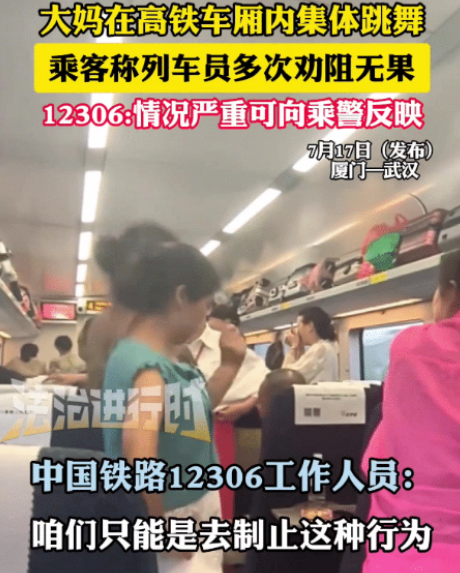 7月17日厦门开往武汉的高铁上,骤然炸开的音乐打破了车厢平静。几位大妈旁若无人地站起身,掏出手机对准镜头——竟然在狭窄的过道上录制起跳舞视频!高分贝的节奏轰炸着整个车厢,后排乘客忍无可忍:"声音能小点吗?太吵了!" 大妈们却仿佛戴上了金钟罩,对周遭抗议充耳不闻,依旧在自导自演的舞台中沉浸旋转。乘务员闻讯赶来劝阻,怎料几次三番都未能撼动这"舞林大会"。当列车人员无奈离开后,欢快强劲的节拍又立刻重新灌满车厢。 有过乘车经历的人都见过这样的场景:若是孩童哭闹声稍大,乘务员一个温和的提醒,年轻的父母便会立刻红着脸轻声劝阻。而这群大妈却将"劝阻无效"演绎得淋漓尽致。这般"金钟罩铁布衫"的姿态,恰与年轻父母薄如蝉翼的面皮形成惨烈对比。 12306工作人员坦言,面对此类行为,列车乘务组只能尽力劝阻。如若情况严重,苦不堪言的乘客可选择向乘警正式反映。一席官方回答背后,道尽了公共空间管理难题的无奈。 这场"高铁舞林争霸"落幕时,留下满车厢低气压的乘客和消散不尽的回音。当自在舞蹈与舒适旅程被置于天平两端,究竟该让哪一边下沉?这群陶醉于音乐的大妈们,在迈开舞步的瞬间,可曾听见公共空间里那份无声的约定?