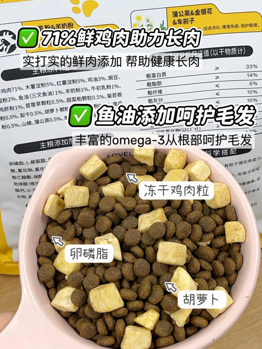 1⃣看配料表,以肉类为主的高鲜肉含量的粮,拒绝谷物添加,成分表要清晰明确