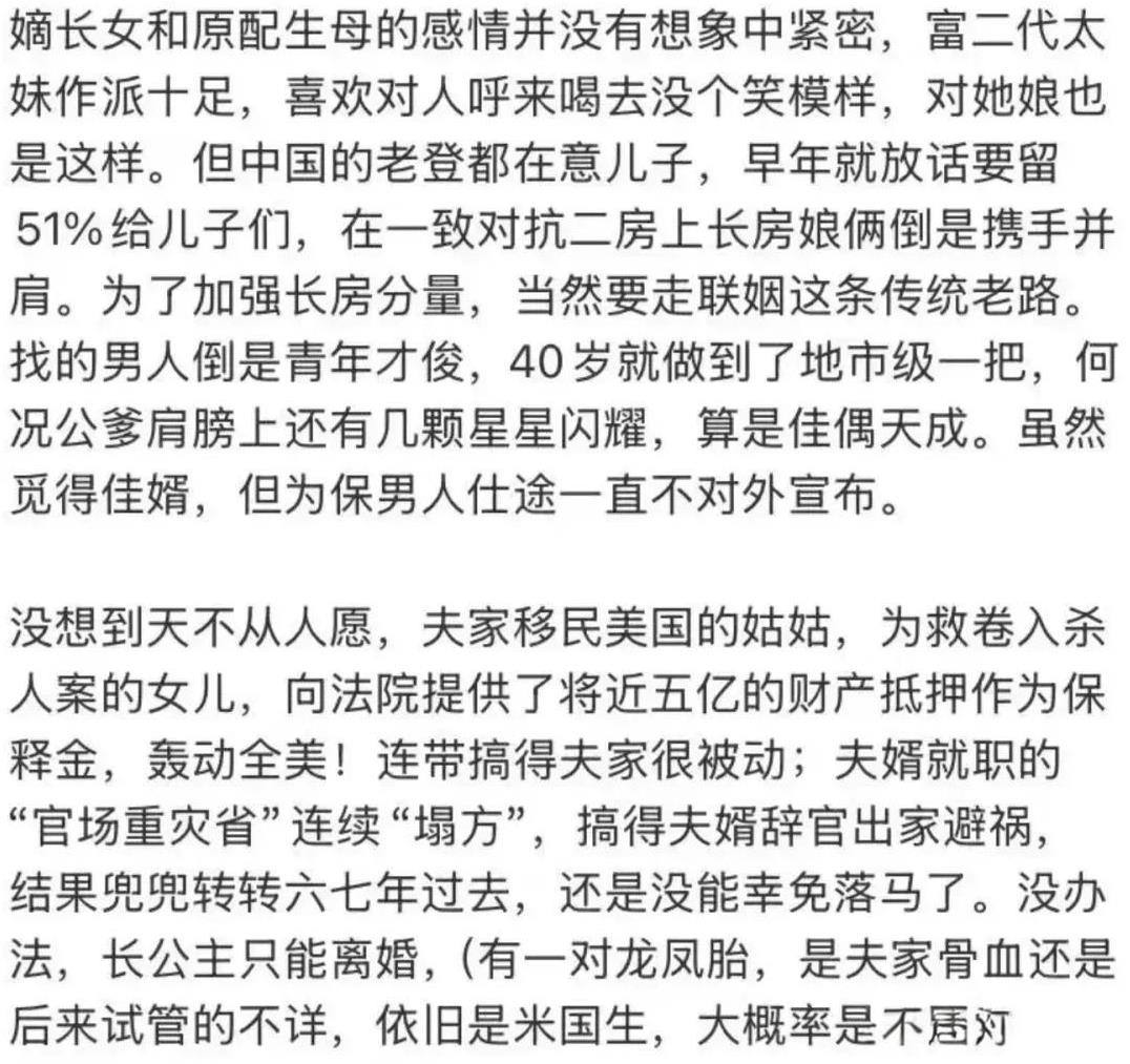 这个首富没有秘密?哪来的秘密,都被扒出来了。 起初扒小三,出来三个娃,后来又扒可能存在更多情妇和更多孩子。就在围绕情妇和孩子问题还没搞清楚的时候,又被扒出来女婿一家的劲爆事。 这瓜一个比一个大,事态有种朝着更不可收拾的方向发展。现在的焦点是宗馥莉的婚姻和孩子。网传,宗馥莉有三个孩子,一胎是个女儿,二胎是一对双胞胎,但都是美国籍。 另外,宗馥莉前夫家的背景可不简单,尤其是前夫哥的姑姑,在美国曾因拿出5亿保释金而轰动全球。对于宗馥莉夫家有没有对她有所帮助,又是一个挖掘方向。