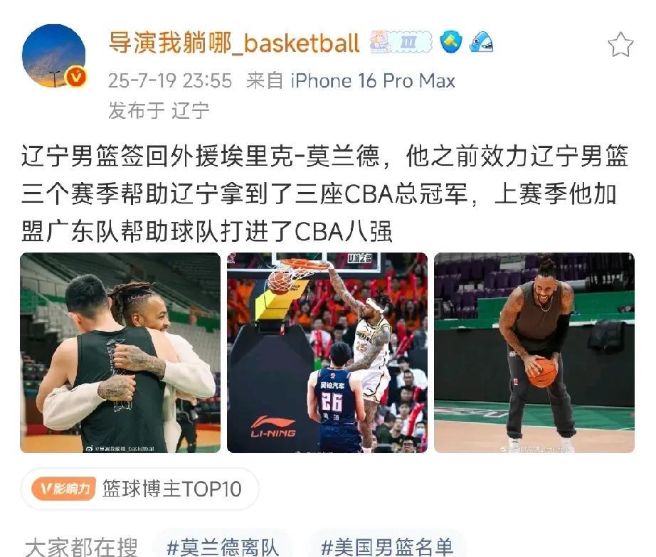 辽宁知名媒体人深夜透露两点: 一:赵率舟将正式转会宁波男篮 二:莫兰德重回辽宁男