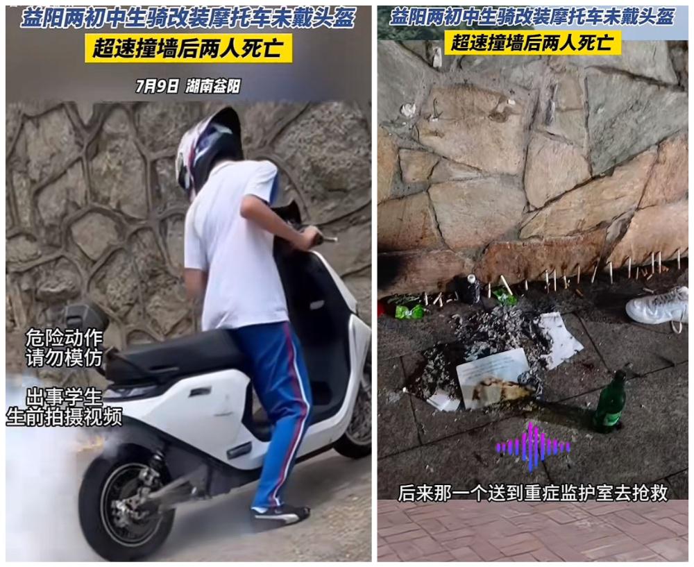 湖南两初中生改装摩托车,超速撞墙这事, 有一点我一直不敢说, 不知道你们有没有发现,现场有留下来的一些悼念东西。
