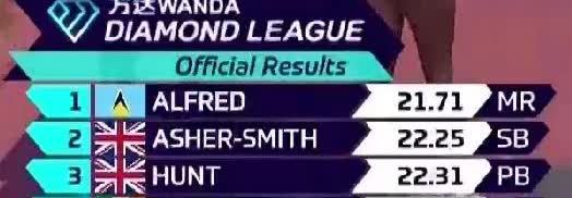 北京时间7月19日,在2025年钻石联赛伦敦站女子200米的比赛中,圣卢西亚的短跑明星阿尔弗雷德以21.71秒获得冠军,创造今年世界领先成绩和新的赛会记录,英国名将阿什.史密斯以22.25秒获得亚军,另一名英国选手亨特以22.31秒获得季军。 伦敦站的原赛会记录是巴黎奥运冠军、美国选手托马斯在2024年创造21.82秒,今天宣布正式作古,今年女子200米的世界前二成绩均由阿尔弗雷德包揽。这场比赛,阿尔弗莱德浑身是劲,自始至终保领先,是今天唯一打开22秒大关的选手,目前来看,阿尔弗莱德在200米这个项目上也只有托马斯可以抗衡。