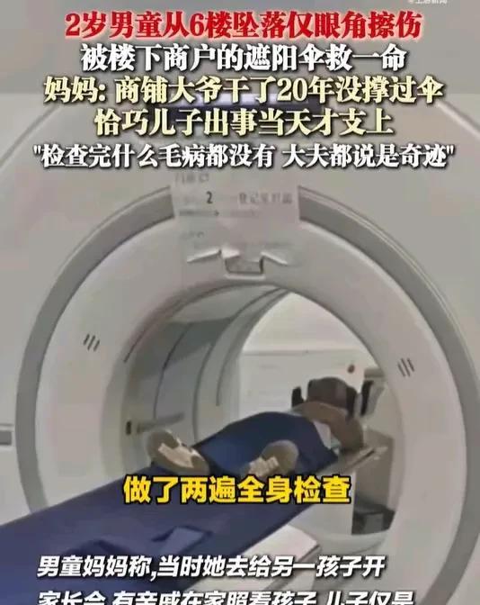 妈妈声称太巧合,楼下商铺大爷20年第一次撑伞,今天刚好接住坠楼的儿子。医院全身检查无毛病,仅眼角擦伤。 医生:奇迹! 网友:福报!