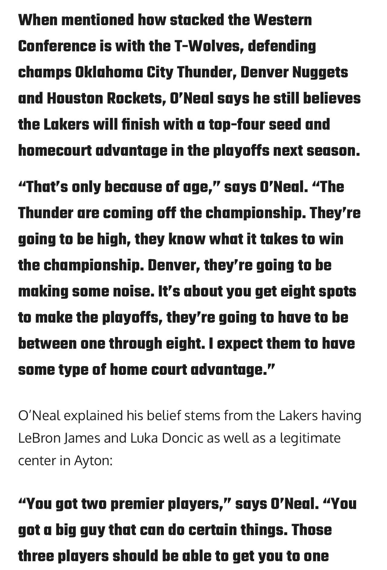奥尼尔近期接受采访表示,相信湖人下赛季能以西部前四进入季后赛并得到主场优势: “雷霆刚拿了总冠军,士气正盛,他们明白了夺冠需要付出什么。掘金也会有出色表现,但要知道,季后赛有八个名额,他们得排在西部前八。因此我预计湖人会有某种程度的主场优势。” 我之所以这么认为,是因为湖人有两位顶级球星勒布朗和卢卡、还有实力可靠的中锋艾顿。这三名球员应该能让球队打进前四。要是他们没拿到主场优势,我会非常失望。”