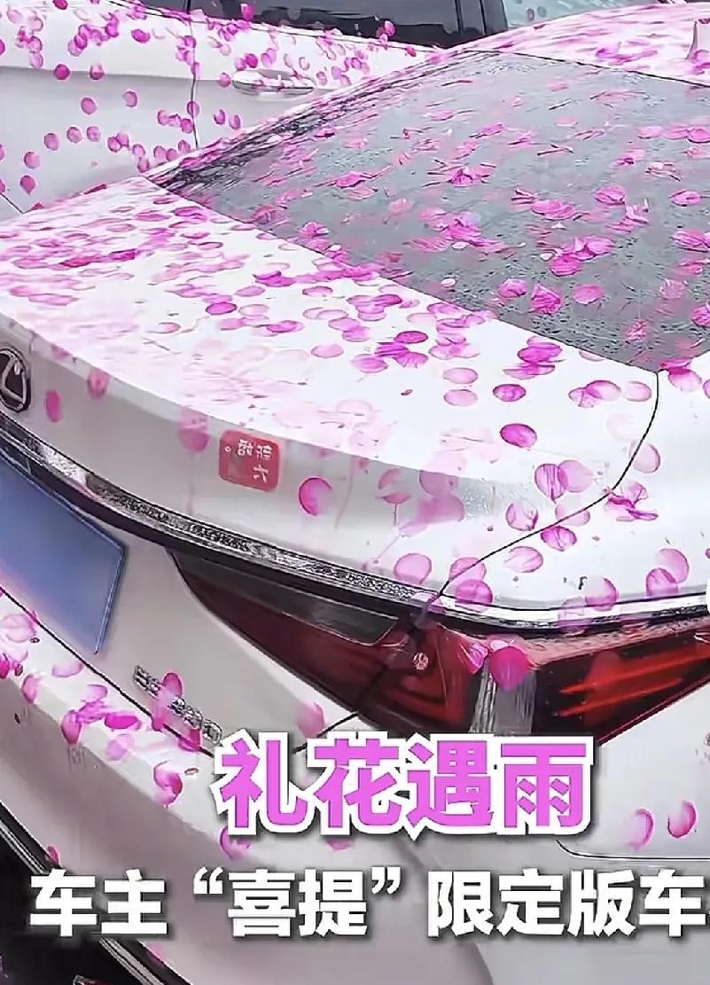 这是什么花的花瓣呀,纷纷扬扬全都落下来了。 又赶上雨天落的。 谁能想到它还掉色呀,这得找谁说理去呀。 再说了,这也洗不掉了,又是白车,虽然成了限量版,但是交警让不让呀,这谁能说得清呀。 不过,确实挺好看的,纯天然自然上色。