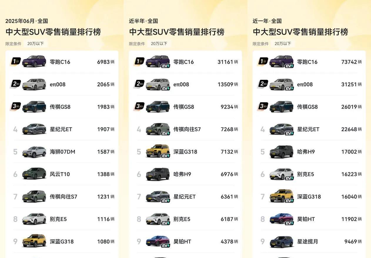 零跑周销继续前二,C16拿下三个第一。 2025年第29周的汽车销量榜单如期而至,零跑的表现依然强势,凭借0.82万的交付量稳居前二,与鸿蒙智行组成新势力第一梯队。 零跑出色的整体销量的背后,少不了旗下车型的热销助力。在20万内的中大型SUV市场,26款C16的霸榜状态强势延续,在其上市后,C16车系凭借6983台的交付量拿下了6月份20万内中大型SUV销量第一。此前,C16已经拿下了近半年和近一年的第一,足以证明市场和用户对其高价值的产品力非常认可。 得益于5座版同级最大二排空间、同级唯一“一键电动放倒成床”模式,以及6座版二排座椅侧滑+190mm超宽通道,二排155°大仰角靠背等越级的舒适大空间;还有车载冰箱、激光雷达端到端大模型辅助驾驶等越级配置的加持,必定会给零跑贡献更多销量。 那么,大家猜猜零跑7月的交付量会是多少呢,有没有可能破5万? #零跑汽车##零跑c16##家用SUV推荐##造车新势力#