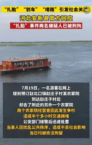 白洋淀12号发生的游客汽车轮胎被扎,河北安新今天回应两名涉事老人已被刑事拘留。这个处罚决定来的太晚了,人们已经等了11天。 另外据安新官方消息,19号发生的堵路事件几名当事人,也在当天被拘留。