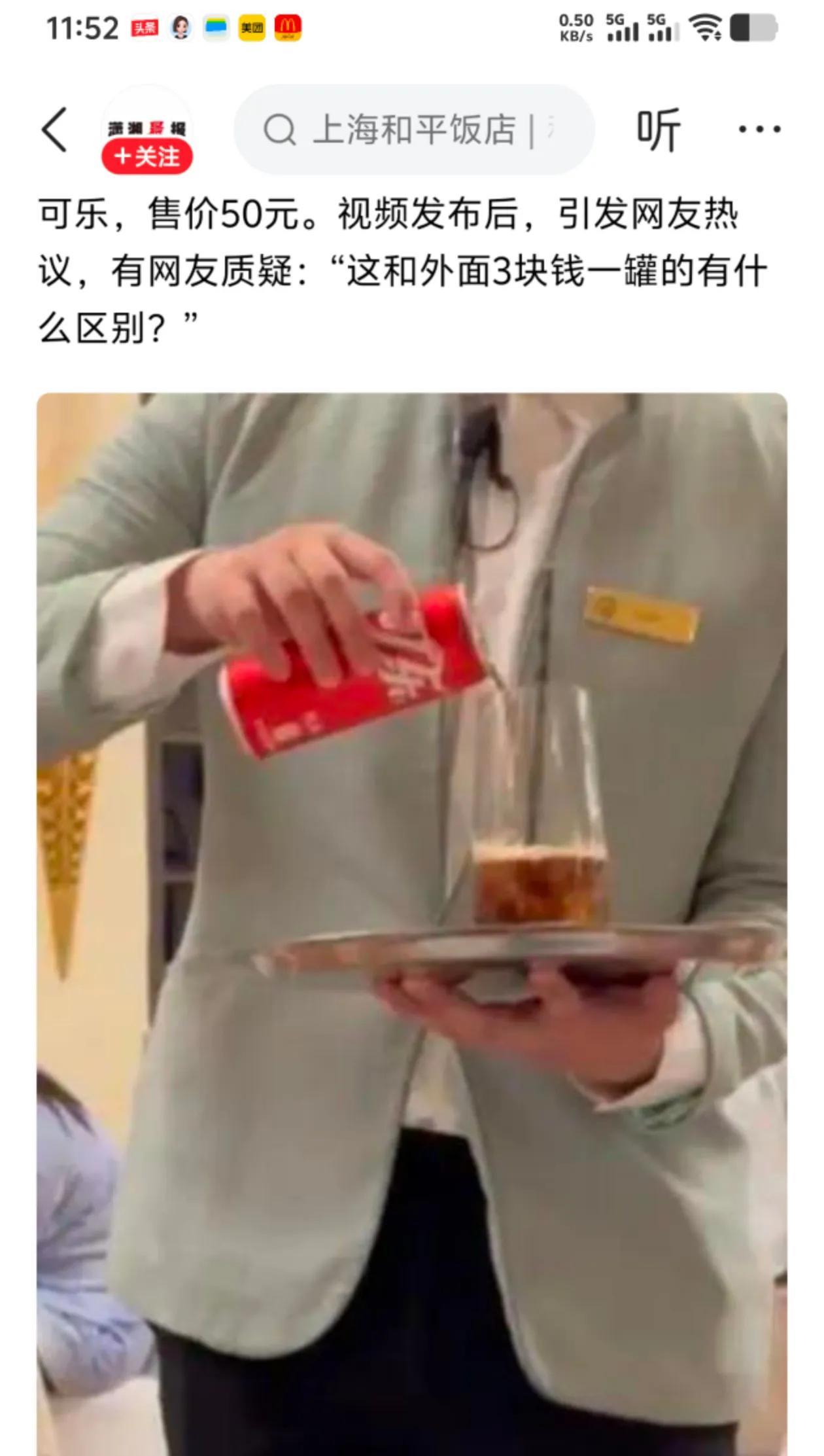 你没有看错, 这是上海和平饭店50元一杯的可乐。 其实这不是可乐贵了。 而是消费的环境和服务贵了。 你在和平饭店享受一流的环境,一流的服务,可乐就是这么贵的。 一个愿打一个愿挨,这个事情没啥好说的。 要是我的钱够多,我也不在乎他一杯可乐卖50元。