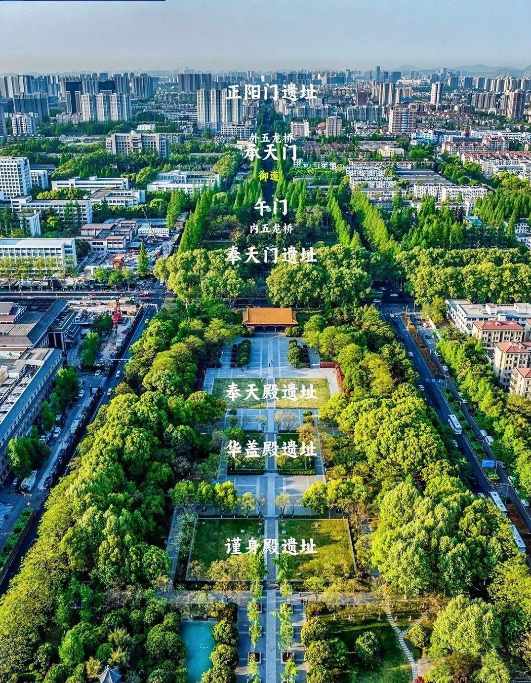 南京也有中轴线:旧时帝王御道,今朝百姓乐园 什么是城市中轴线呢?简单来说,它是一种城市规划的设计手法,通过一条直线或曲线把城市的重要建筑、景观和公共空间串联起来,形成一种视觉和空间上的连贯性。听起来是不是很美? 南京明故宫中轴线仿佛一条岁月长廊,将明朝的辉煌历史与众多人文景观紧密相连。自1366年明故宫由刘伯温主持兴建,历经20余载方才竣工,其宏伟规模据说曾一度被誉为中世纪世界之最。直到明永乐十九年(1421年),明成祖朱棣迁都北京,南京明故宫才正式结束王朝皇宫的使命。 谨身殿:紫禁城三大殿之一,承担皇帝更衣、册封皇后、皇子及宴会等典礼功能。 华盖殿:紫禁城三大殿之一,承担皇帝大典前休整、阅视祝文等礼制功能。 奉天殿:紫禁城三大殿之一,举行重大典礼和接受文武百官朝贺的地方。 内五龙桥:坐落于宫城内的金水河上,连接着午门与前朝区宫门。 午门:宫城的正南门,因其居中向阳,位当子午,故名。明故宫遗址上最大的地面建筑遗迹。 御道:专供皇帝通行的道路。御道沿线,吏部、户部、礼部、兵部和工部不见了,换成了不同年代建成的小区。 承天门:皇宫南面的正门。 外五龙桥:沟通着御道南北,一直沿用至今。 正阳门:宫城南北中轴线上最南端的大门,故得名,象征京城的正门地位。