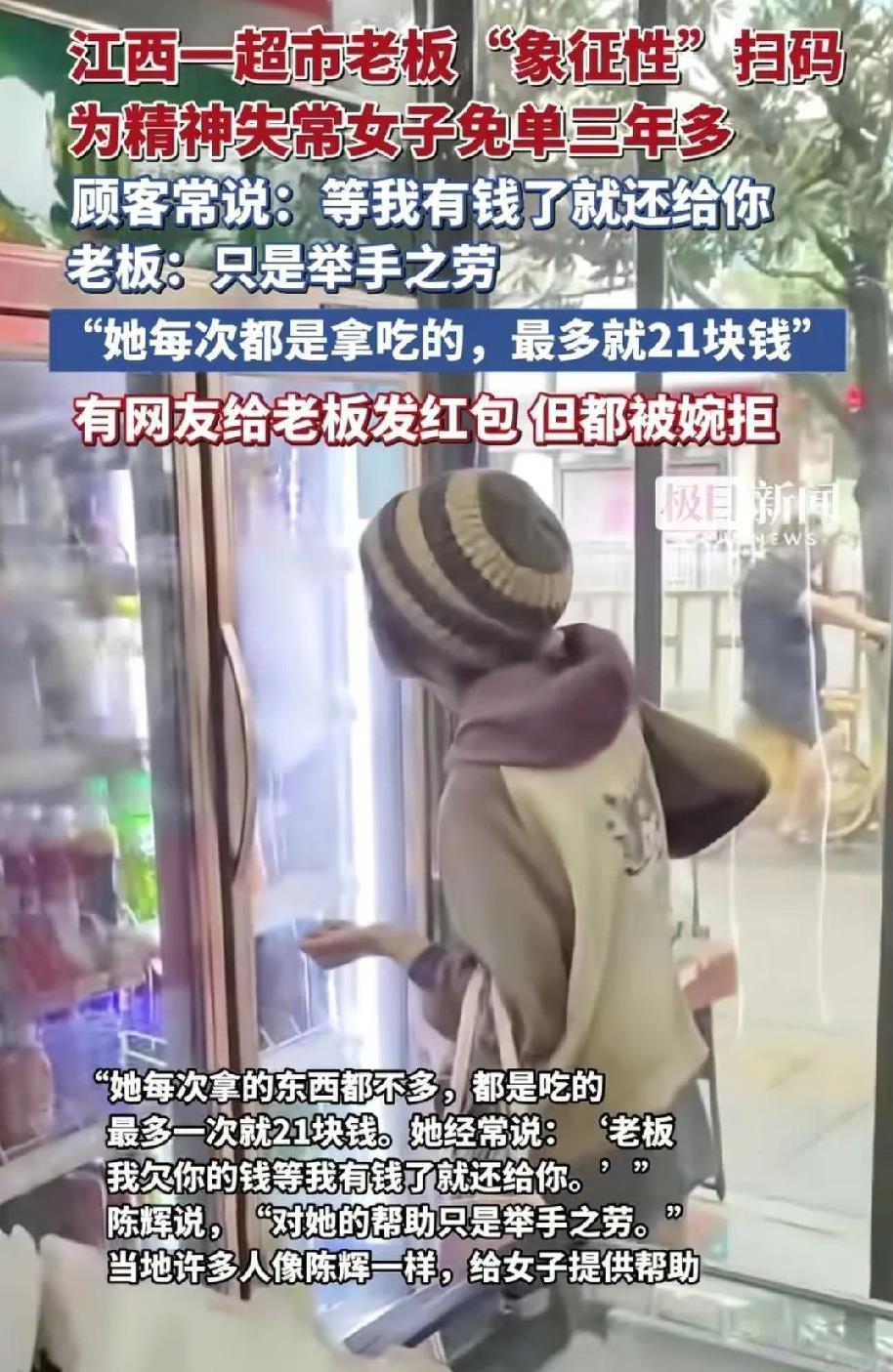 江西便利店老板为精神失常的女子免单三年多,老板的一句话说出大格局! 江西萍乡一位便利店老板说:女子是在2021年来店里买东西。拿了面包和可乐一起七八块钱,女子跟老板说能不能欠着?老板说可以,就让女子把东西拿走了。 此后女子每一次来,老板都是象征性的扫一下女子的二维码。并没有实际收钱,而女子也会经常说一句话“老板等我有钱了,我一定会把钱还给你”。 此前老板也有拍视频发布到网上,有热心的网友给老板发红包,老板都拒绝了,后面老板再也没有发过视频。 老板说这些视频老是发就没有意思了。但对女子的爱心会一直持续下去。 老板还说当地有很多人跟自己一样对女子很关心,所以这件事情不值得一提! 老板真是大格局! 对一个普通的邻居能坚持三年多真的是不容易。 在发布视频后,面对网友的热心捐款,老板一一拒绝,甚至在视频有热度后,老板停止发视频,这两件事情不是每个人都能做到的。 给老板点赞,做到了真正的大爱无疆。