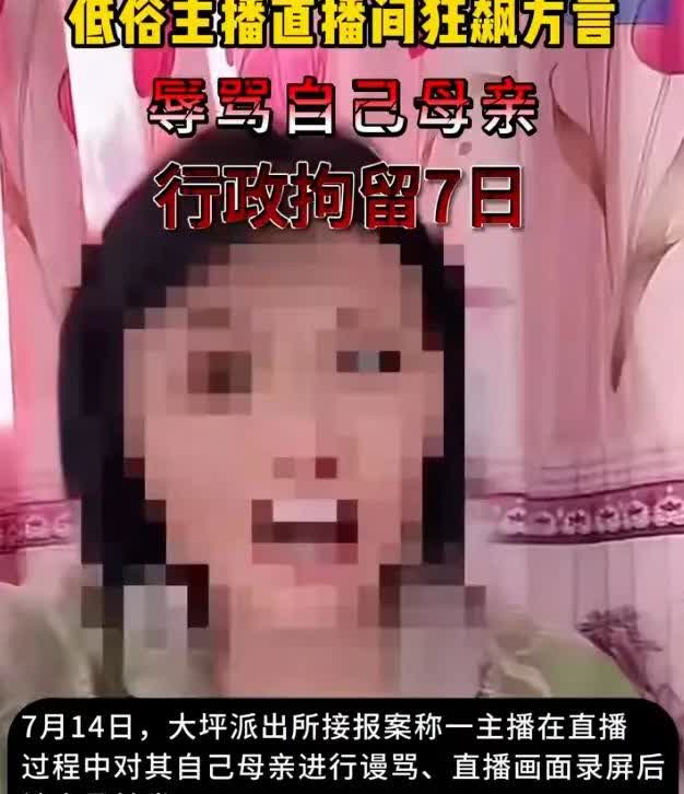 湖北咸宁。女子太奇葩。竟然直播辱骂母亲。 原来女子在家直播时,被从田间劳作返家的母亲责备了几句,女子跟母亲顶嘴,进而破口大骂母亲,造成极坏的影响。被刑拘7日。 网络平台的监管功能哪去了?在线观看的网友在评论区劝阻她的不当行为,她都没有理会。是不是直播时平台来不及按下暂停键?只能听之任之? 羊羔都知道跪乳,乌鸦都知道反哺,连最起码的孝道都没有,就想靠直播当网红赚大钱,对自己的父母大不敬,一点基本素质都没有。平台可以对她永久封号,禁入直播行业,否则不能杜绝这种低俗行为。