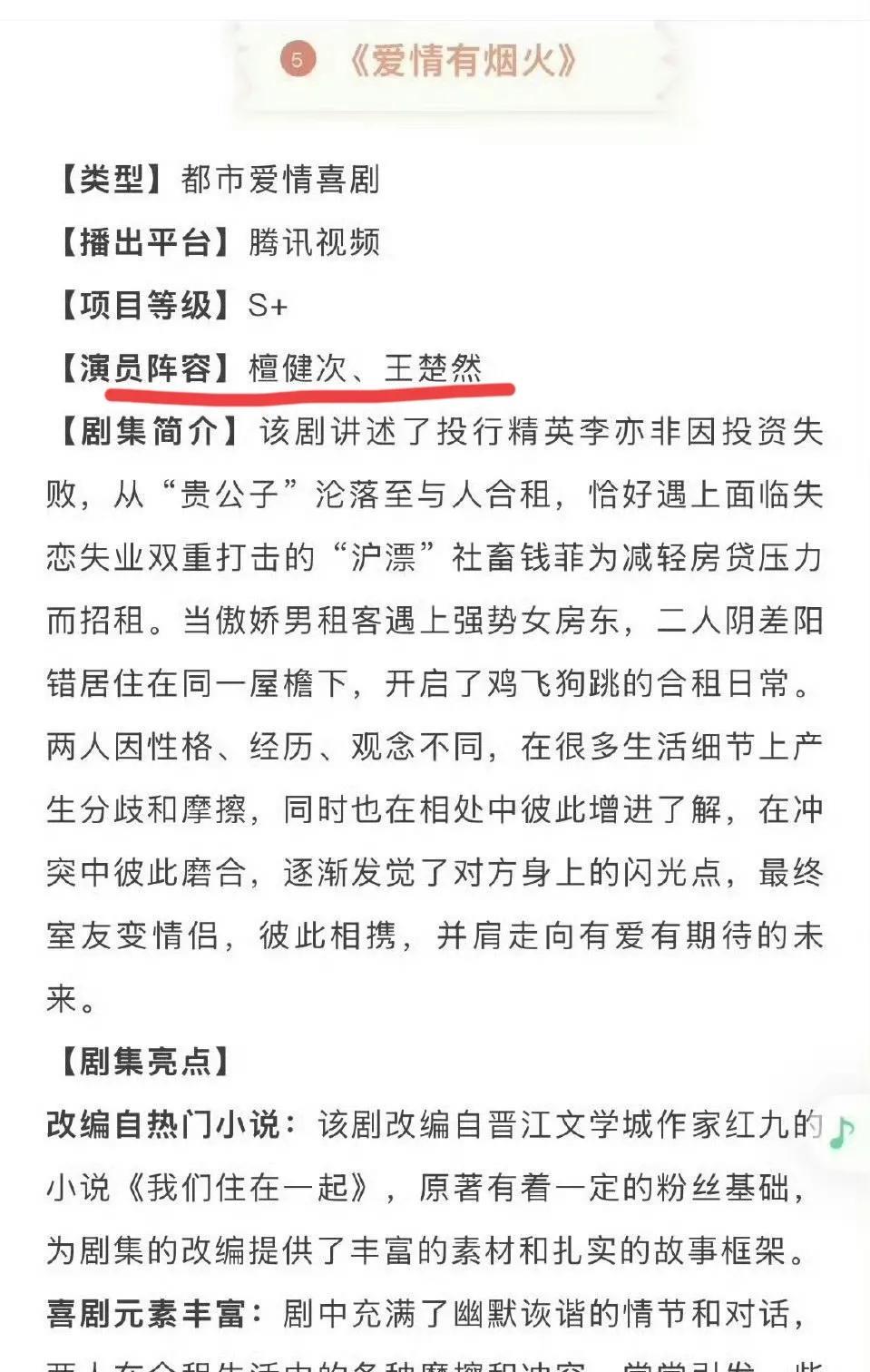 啊!真的吗? 檀健次最后一部电视剧存货《爱情有烟火》终于要动了吗?? 这部剧真的是命运多舛啊,最开始网传女主选的是毛晓彤,后来换成王楚然,不过毛晓彤那边否认了。 开机的时候,刚好遇到王楚然跟杨洋那部消防剧播出,好多观众开始抵制“白粥姐”,因此也牵连到檀健次这部剧。 当时好多观众说绝对不会看,即使有檀健次也不看[泣不成声] 再后来这部剧拍完就没什么消息了。 最近网传这部剧开始启动招商了,王楚然的口碑也好转了,我倒是觉得现在播算一个不错的好时机。 檀健次的存货目前就剩一部电视剧和一个电影。赶紧把这部剧播了,督促檀健次早点进组也是好事哈哈哈[机智]