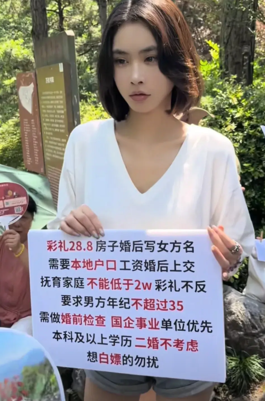 在公园相亲角,撞见个有意思的事儿 今天逛公园,在相亲角那儿瞅见个小姐姐,人挺直白,举个牌子把自己找对象的条件明明白白写上了 。 牌子上写着彩礼得28.8万,房子婚后要写女方名,还得是本地户口的男方,婚后工资得上交,抚养家庭的收入不能低于2万,彩礼也不返还。要求男方年纪不超35,得做婚前检查,国企事业单位的优先考虑,得本科及以上学历,二婚的就别来了,最后还补一句“想白嫖的勿扰” 。 这相亲条件一摆出来,围观看热闹的人不少,大家议论纷纷。有人觉得现在相亲都这么直接了,把条件摊开说清楚,省得后面麻烦;也有人觉得这要求不低,想找符合条件的男方,估计得费点功夫。 其实吧,相亲就是个双向选择的事儿,有人敢大大方方把自己想要的生活、对另一半的期待摆出来,不管成不成,至少够坦诚。不管啥条件,能遇到互相看得上、能好好过日子的人,才是正事儿。你们说呢?