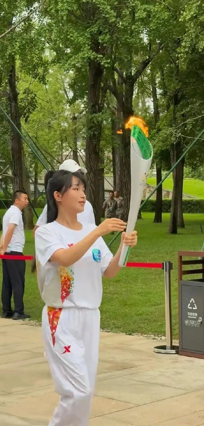 李子柒今天在成都世运会火炬传递时状态挺清爽的,扎高马尾穿白色运动服,全程带着笑。