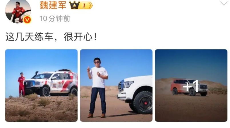 就在刚才,魏建军在社交网络发出的,他们在甘肃敦煌玩越野的照片,这么热的天气,他依然很注重自己的形象,穿着深灰色的长牛仔裤配着纯白色的短T恤,这是他讲话的时候的造型,真正开车的时候,他还穿上了专业的越野拉力赛运动服,一身的红色看起来非常的时尚!
