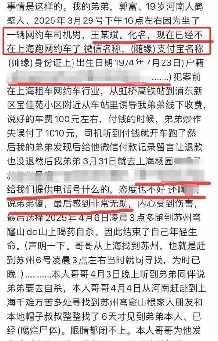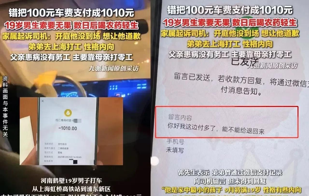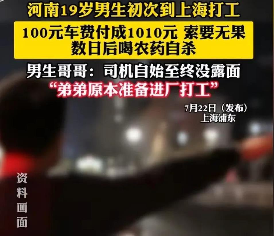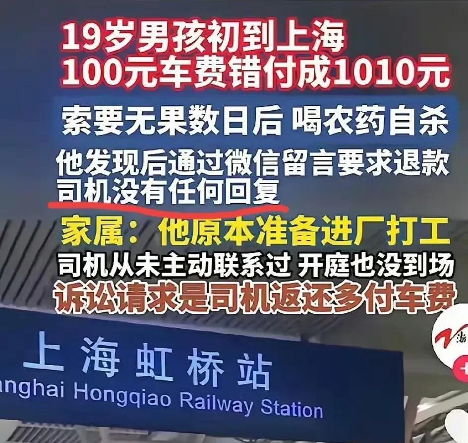 司机很坏,小伙很傻。 小伙小郭从河南前往上海。 下了火车之后,他打算搭车。 和司机谈妥,车费为100元。 到达目的地时,小郭手一滑,误把1010元当成100元付了出去。 他期望王姓司机能够退还,可司机无论如何都不肯退还。 王姓司机决意昧着良心将这笔钱据为己有。 小郭是来上海打工的,打算进厂工作。 他的家庭状况不佳,父亲还身患疾病。 这笔钱是他东拼西凑而来的,往后还得靠这笔钱开销呢。 小郭愈发气愤却又无计可施,最终买了农药喝了下去。 王司机必然会遭到社会唾弃,我只是觉得这孩子太单纯了,这种事是可以报警的,这笔钱被司机非法占有,他吞不掉的!搭上一条性命太不值了 。