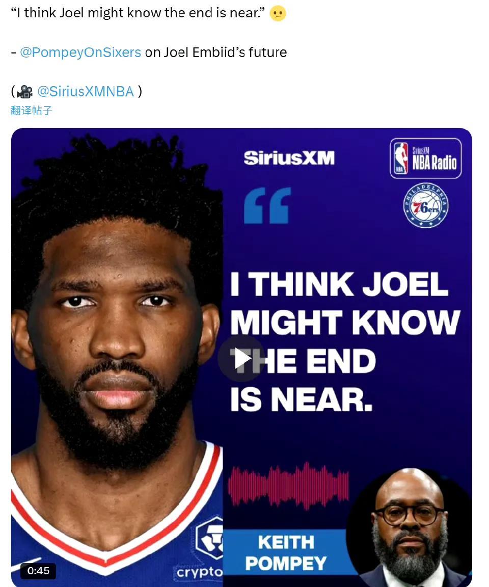 费城记者Keith Pompey: “我认为乔尔·恩比德可能意识到自己终点快到了。这算是对于他经历的事情的一种解释,因为几乎不会有人告诉你乔尔·恩比德承受了多少痛苦。” 2024-25赛季,恩比德因伤只出战19场常规赛, 2023-24赛季,他也只出战39场常规赛。 这位2022-23赛季常规赛MVP,两届常规赛得分王近两年饱受伤病困扰。31岁的他与76人的合同到2029年夏天结束,平均6077万。