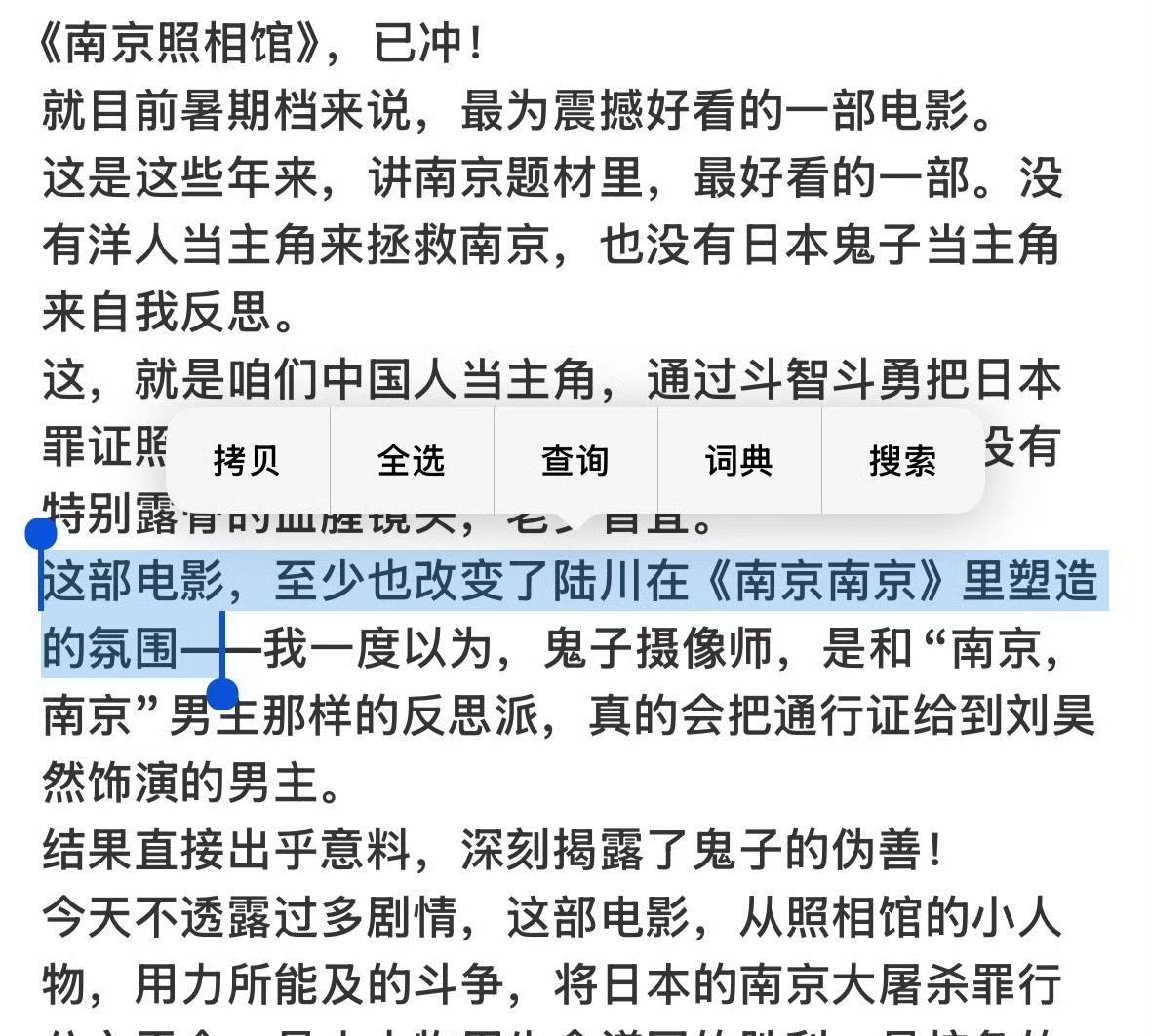 可怜的陆川导演,只要有和《南京!南京》同题材电影上映,就会被影迷拿出来挂。这次《南京照相馆》爆火,《南京!南京!》,甚至老谋子的《金陵十三钗》也都被拿出来鞭尸。 其实影迷说的很对,三部影片最大的区别就在于视角的选择。《南京!南京!》最大的错误在于在一个中华民族的沉痛悲剧中诡异的选择了日本人视角。 片中日本人角川正雄的悲剧戏份太过突出,贯穿了始终,彻底把整部影片从中国人的受害视角硬是转变成了日本人的受害视角。把影片主题变成了一个日本人的良知是如何被战争摧毁的。这种表述其实是战后日本电影常常使用的,比如《望乡》,《野火》,《男人们的大和》之类的影片。 至于老谋子的《金陵十三钗》,为了参加奥斯卡,又选择了美国人视角。从国际拯救者的角度在描写这场灾难,结果拍成了商业性的战争爱情巨制,甚至还的安排姑娘和老外谈情说爱,真是相当尴尬。 这次《南京照相馆 》就没有像之前两位想那么多,好好的从中国人的视角讲一个斗智斗勇的故事,对日本人的描写也是战争如何让对方更加冷血和虚伪。毕竟美国人拍了那么二战大片,除了《辛德勒的名单》和《刺杀希特勒》之外,有人性的纳粹角色也屈指可数。真没必要在一个描写中华民族的苦难电影中让日本人大发善心。#如何看待《南京照相馆》中的人物抉择# #南京照相馆#