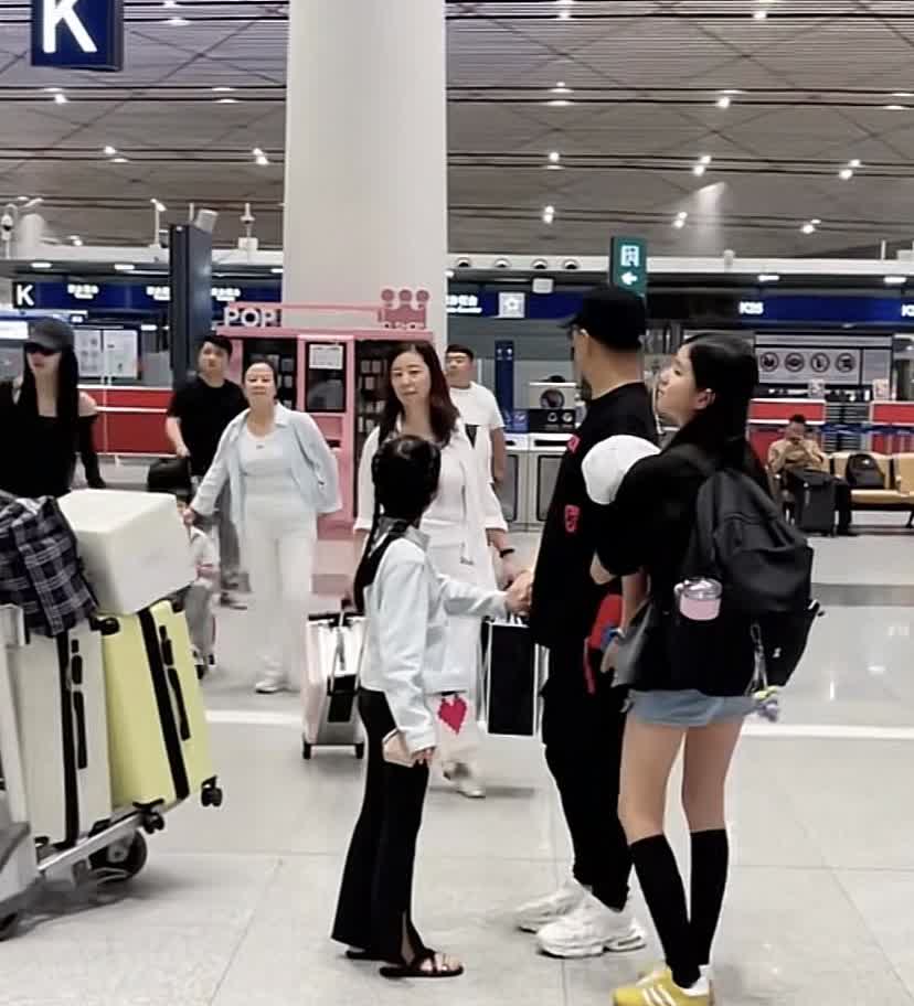 汪峰这次带着四个孩子走机场,一手牵着醒醒和二女儿,大女儿独自拉行李箱跟在后面,继