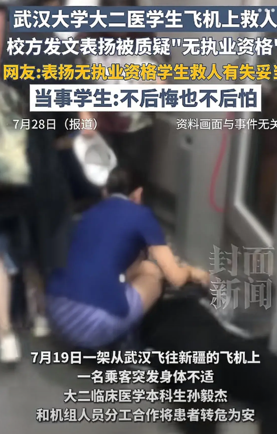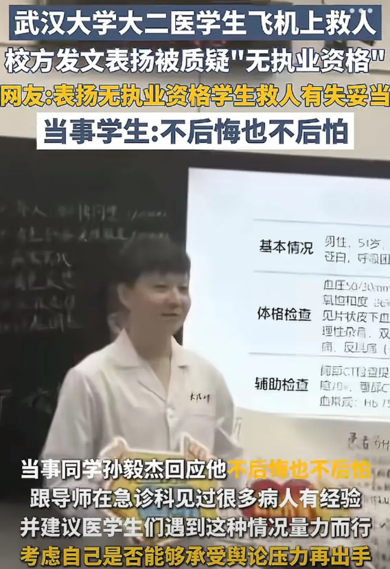 武汉大学,大二医学生孙毅杰在飞机上,救助突发呼吸困难的乘客,乘客转危为安后,学校点赞表扬了孙毅杰的行为。而有网友质疑孙毅杰:没有行医资格,不该在有限的环境里对病人实施抢救,学校更不应该对他进行表扬。 孙毅杰回应:“我只是对她进行检查后,让她平躺吸氧,并无其他举措。我不后悔救人,也不后怕,跟着导师在急诊见过很多病人,有经验。” 但是孙毅杰又劝学医的同学们:“遇到这种情况要量力而行,考虑自己能否承受舆论的压力再出手。” 我猜,孙毅杰出生在医学世家。