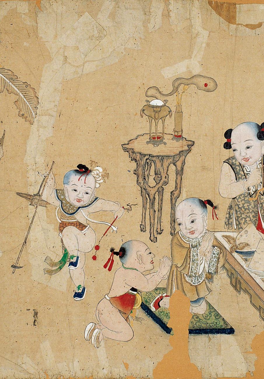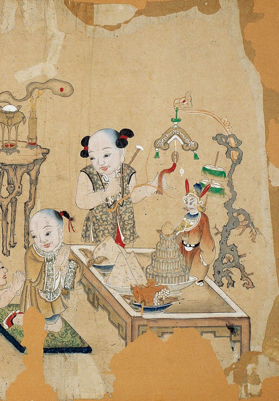 东方生活美学:中秋节祭兔爷。这是清代杨柳青年画“桂序昇平”年画,表现了六个童子祭拜兔爷的情景,他们有的奏乐,有的拿着锄篮模仿采药,有的双手合十跪拜,人物活灵活现,场面喜庆热闹,洋溢着中秋团圆的欢乐气氛。中秋节,在农历八月十五,恰值三秋之半,故称“中秋”。这天月亮正圆,也叫“团圆节”,是我国的传统节日,节日里有祭兔爷之俗。传说,月亮里有只玉兔在桂树下捣药,人们由此也称月亮为“兔轮”,因此祭兔爷也有祭月之意。此画标题“桂序昇平”,汉字中“桂”与“贵”谐音,桂树在人们心目中是一种象征富贵的植物;神话传说中,桂树又