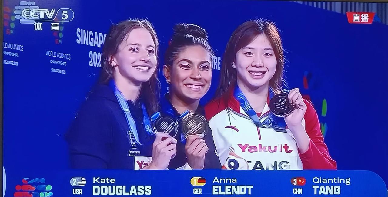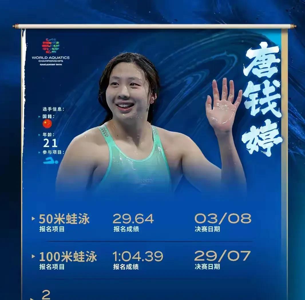 1.504分唐钱婷在100米女子蛙泳中的成绩夺得铜牌,冠軍为德国运动员获得,唐钱