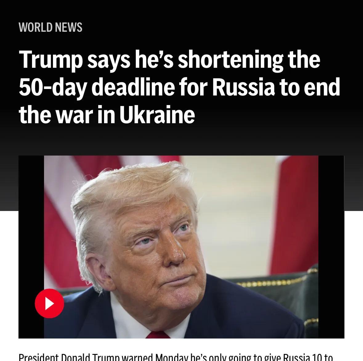 不磨叽了:对俄罗斯期限缩短为10到12天。 据美联社等,特朗普7月28日在苏格