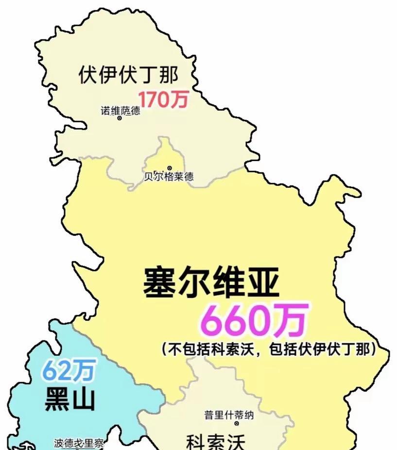 塞尔维亚的“区域性”强国梦,已经不可能了,现在人口仅剩660万左右,综合潜力已经大不如前了。 这660万人口,还是算上了北部伏伊伏丁那的170万人口,如果去掉这部分,塞尔维亚核心地带,还剩不到500万人口,妥妥的一个区域性小国。 现在塞尔维亚能控制的区域人口为660万,相当于一个地级市的规模,而面对的潜在对手,可能要庞大的多,周围一圈的北约国家。 塞尔维亚的未来在哪里?加入欧盟已经成为共识并付诸实际行动,加入北约可能让很多塞尔维亚人接受不了,但未来可能会朝着这个方向走。