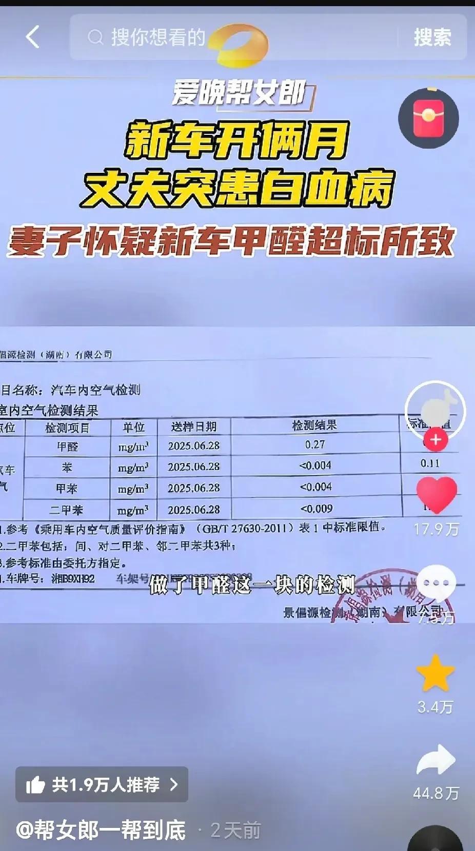 一直以为只有新房才会出现甲醛超标的事,没想到新车也会出现甲醛超标!为了自己的身体健康,买车时要擦亮眼睛了[可怜]有时候擦亮眼睛还不够,还得交给专业机构检查过甲醛没事才能放心买、放心开了[抠鼻]