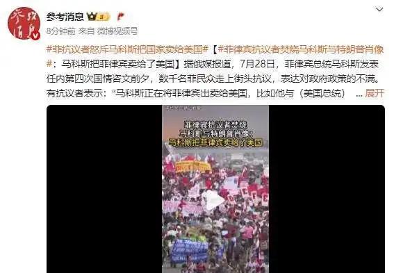 菲律宾人民觉醒了! 在当地时间28日,菲律宾爆发了大规模的抗议游行,并且把怒火撒向了马科斯,怒斥他的卖国行为,高喊口号,痛斥马科斯是卖国贼。 在奎松城的集会现场,一名青年点燃了马科斯的纸质人像,火苗窜起时人群中爆发出震耳欲聋的怒吼:"把国家还给我们!" 这场席卷全国的示威浪潮,全因马科斯政府与美国签署的那份备受争议的贸易协议。 这份被菲律宾媒体称为 "新殖民条约" 的协议,核心条款是菲律宾对美国商品实施零关税,而美国却对菲律宾出口商品征收 19% 的关税。这种单方面让利的条款,让菲律宾在国际贸易中处于绝对劣势。 更令人愤慨的是,协议还要求菲律宾扩大进口美国的大豆、小麦和肉类产品,这直接威胁到本国农民的生计。马尼拉郊区的稻农阿基诺无奈地说:"美国的转基因大豆价格比我们低 40%,我们的收成根本卖不出去。" 抗议者的怒火并非偶然。近年来,马科斯政府的执政表现早已引发民怨。2025 年上半年,菲律宾通胀率持续高企,大米价格同比上涨 8.7%,创 15 年来新高。许多家庭不得不减少主食消费,社交媒体上频繁出现 "一公斤米分三餐" 的心酸分享。 与此同时,政府每年投入 2000 多亿比索的防洪工程却形同虚设,7 月的暴雨导致 627 万人受灾,31 人死亡。民众质疑这些资金被贪污,抗议者在标语上写道:"防洪工程的钱都进了谁的口袋?" 更让菲律宾人感到屈辱的是,马科斯在外交上一味迎合美国。他在国情咨文演讲中声称 "菲律宾是所有人的朋友",却在实际行动中倒向美国。 今年 7 月访问美国期间,他不仅未能争取到更有利的关税条件,反而在特朗普面前承诺加强军事合作。 面对民众的怒火,马科斯政府试图转移视线。国情咨文演讲中,他大谈国防现代化,感谢美国帮助菲律宾军队升级装备。但这种说辞无法掩盖经济困境。 抗议活动中,不同阶层的民众罕见地团结在一起。马尼拉的工人举着 "我们要生存" 的标语,学生高呼 "教育不能为卖国协议买单",就连一向低调的中产阶级也加入游行队伍。 社交媒体上,# 菲律宾不做美国殖民地 #的话题迅速登上热搜,网民纷纷晒出祖辈反抗西班牙殖民统治的历史照片,对比当下的困境。一位网友评论道:"我们的祖先用鲜血换来的独立,不能在马科斯手中葬送。" 这场抗议浪潮显示出菲律宾人民的觉醒。他们不再容忍政府的卖国行径,开始用行动捍卫国家主权。正如一位抗议者在采访中所说:"马科斯以为抱紧美国大腿就能稳坐总统宝座,但他忘了,菲律宾的主人是人民。"