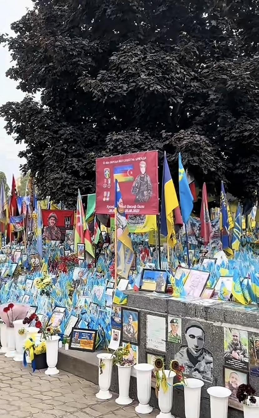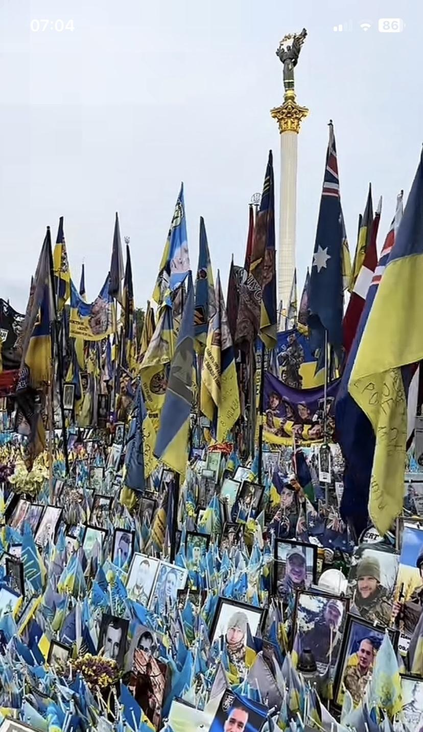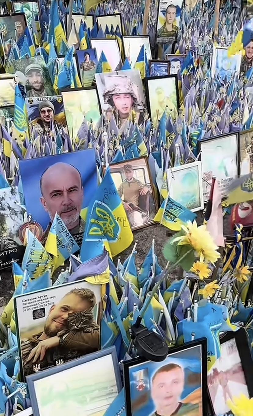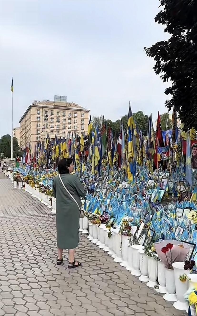 乌克兰女孩亲临基辅中央广场看望英雄们,摆设比之前更壮观了,应该有身份有条件的人才
